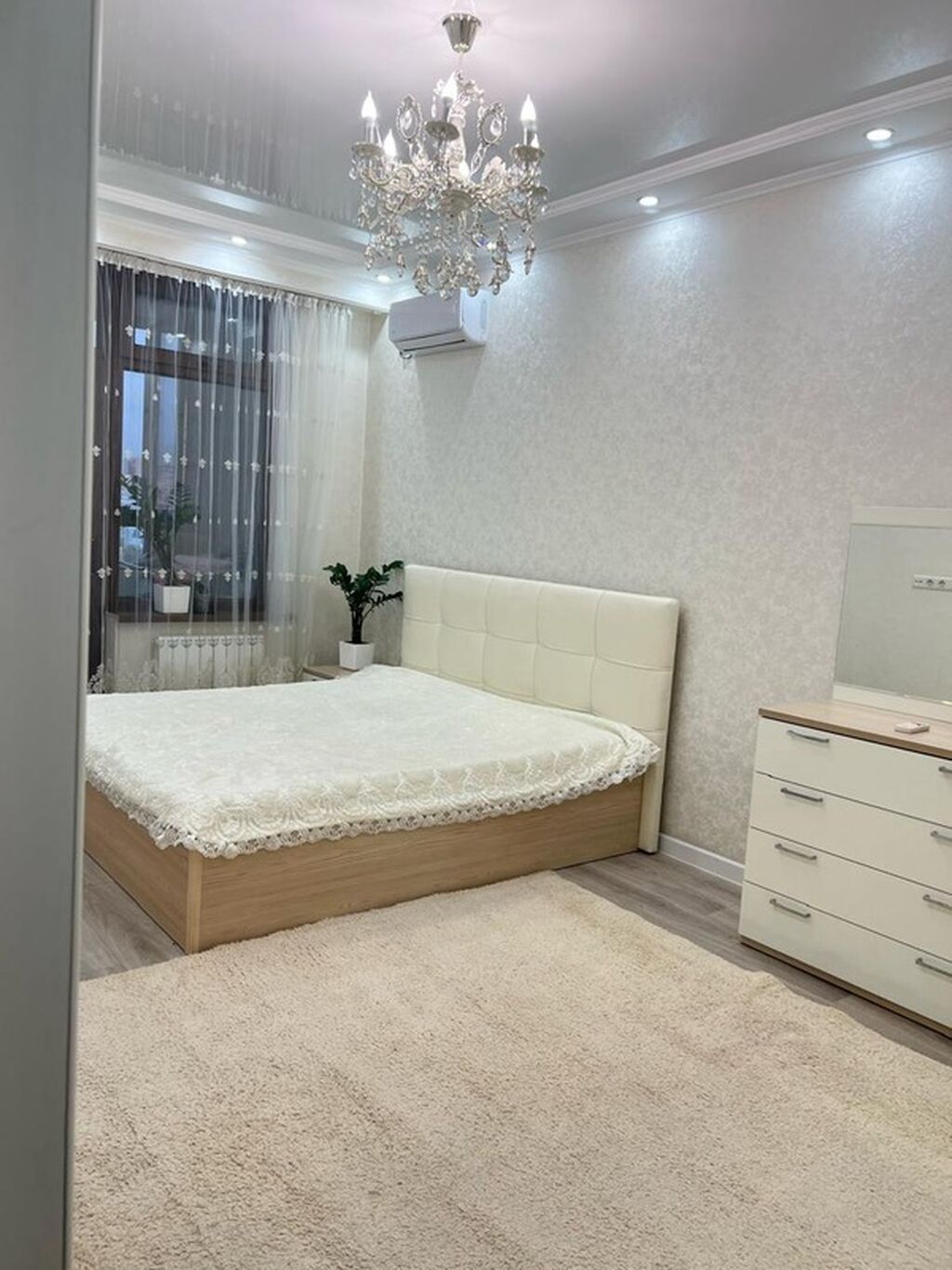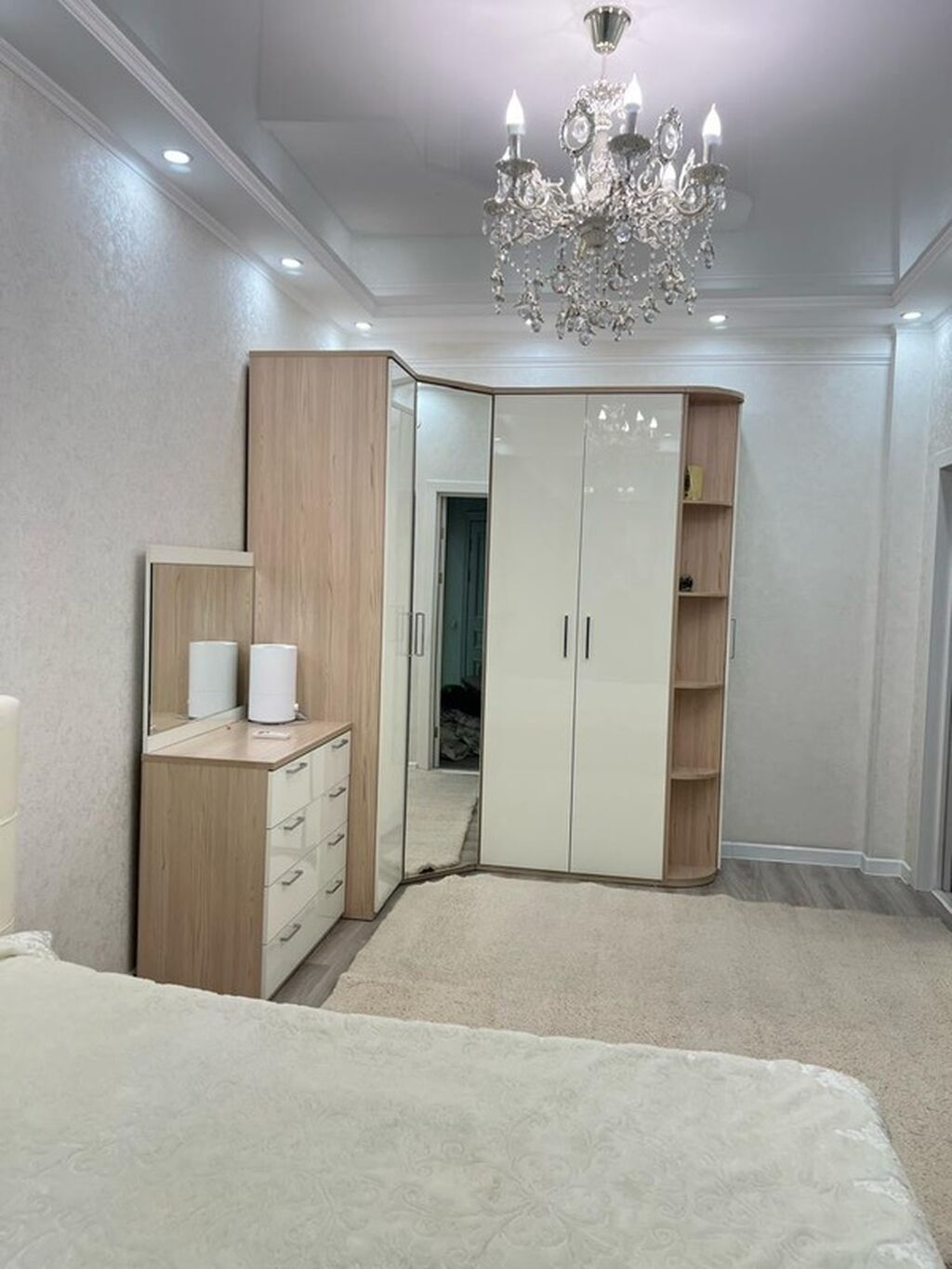 - Просторная спальня: двуспальная кровать с мягким изголовьем, большой угловой шкаф-купе с зеркальными фасадами, комод с тумбой и зеркалом. Декоративная хрустальная люстра, точечная подсветка по периметру, кондиционер, плотные и тюлевые шторы, мягкий ковёр.