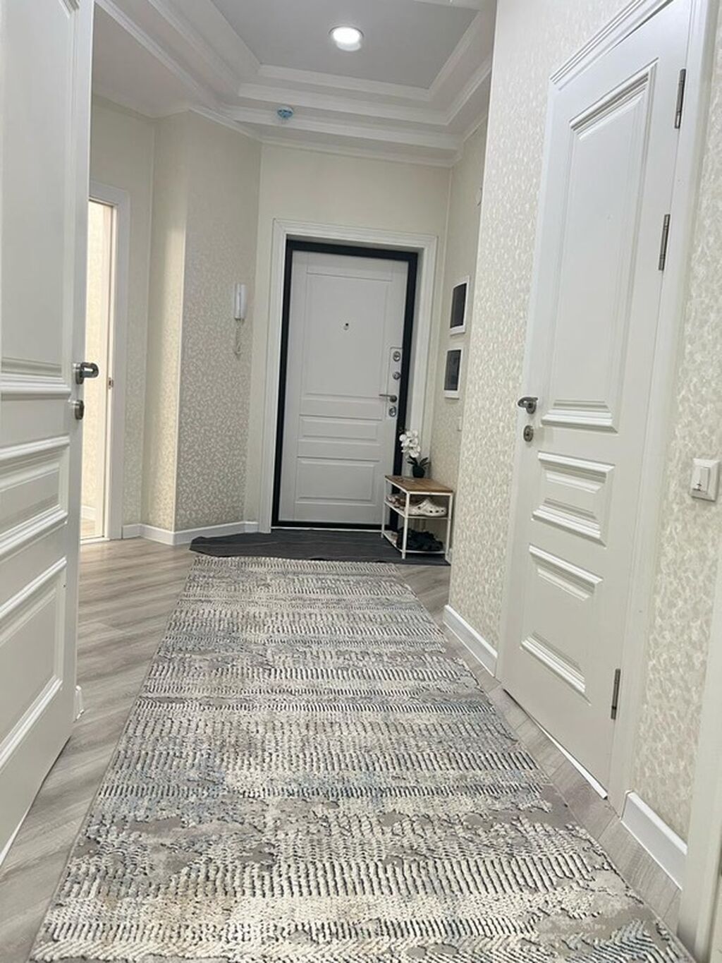 - Прихожая: встроенное освещение, декоративные панели и молдинги, входная дверь повышенной надёжности, длинный ковровый дорожка, система домофона.