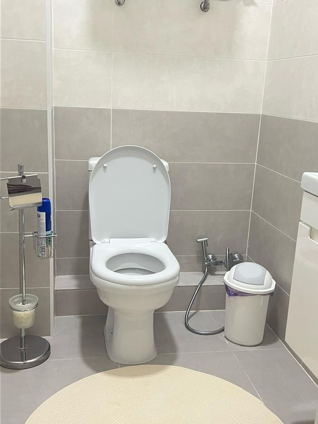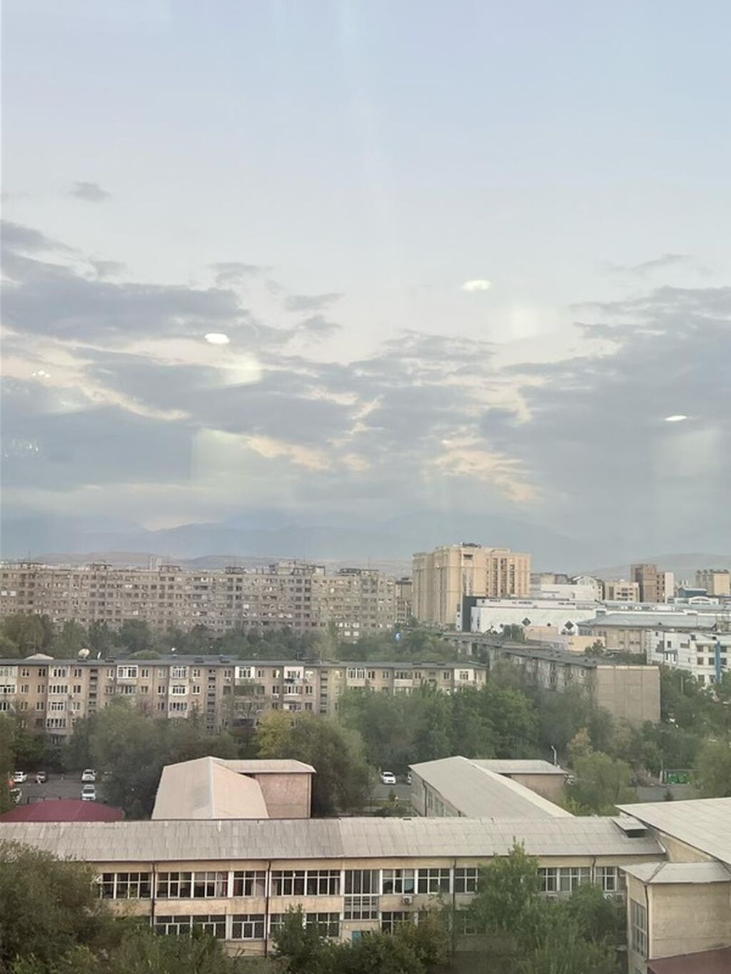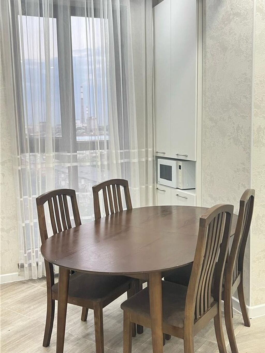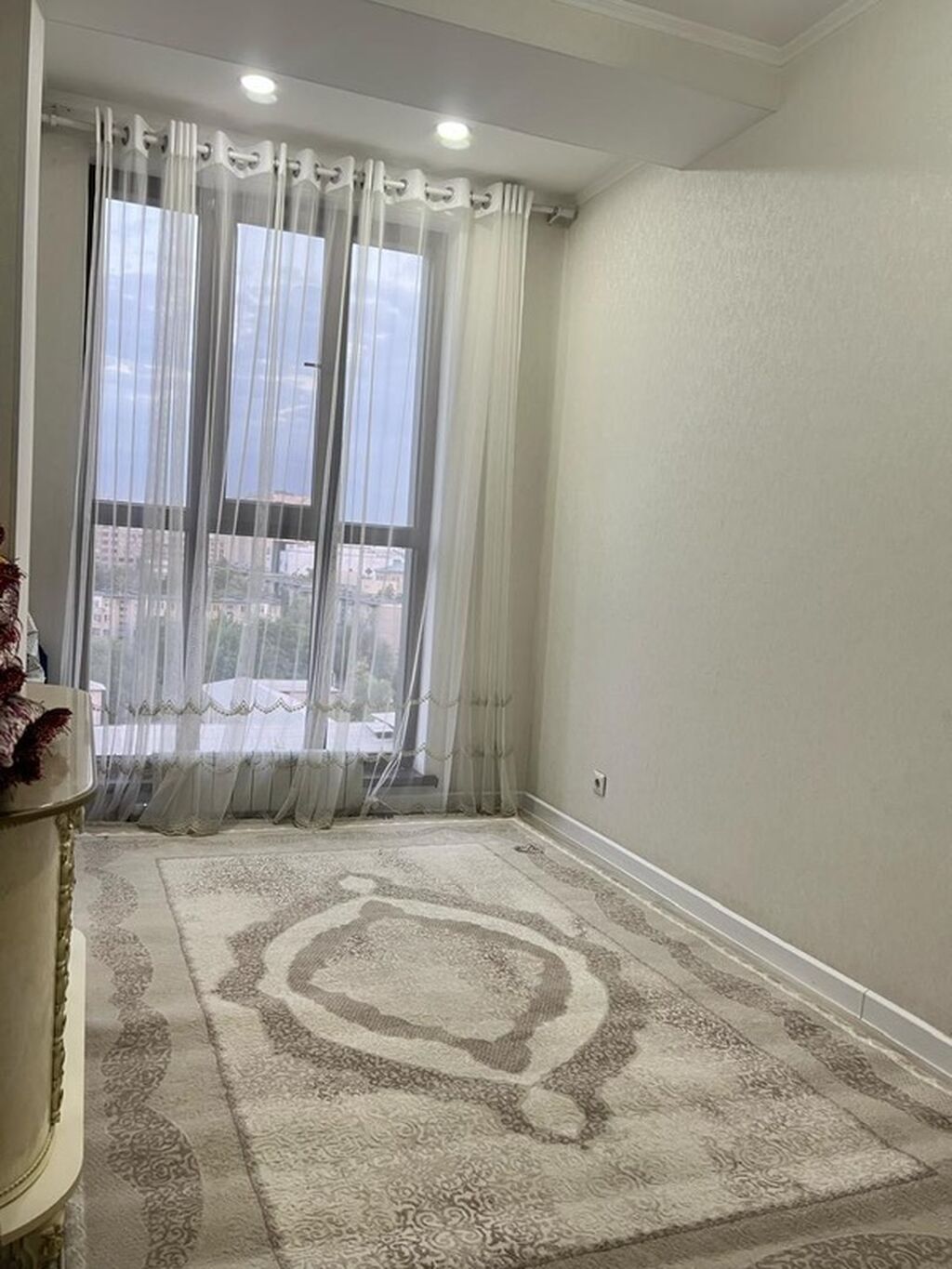 - Гостиная/столовая: диван, большой акцентный ковёр, обеденный стол, кондиционер, потолочные светильники и люстра, панорамное окно с лёгкими шторами.
