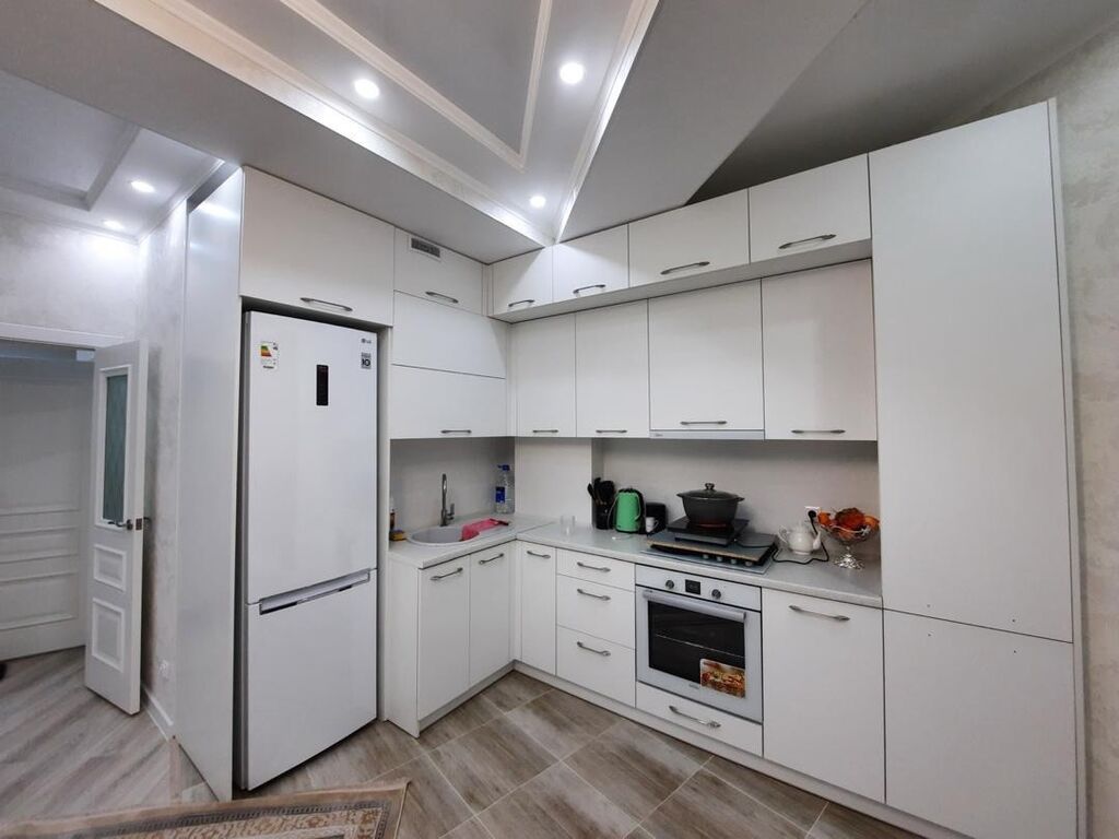 - Отделка: нейтральные оттенки, декоративные обои, напольное покрытие под светлый дуб, многоуровневые натяжные потолки с точечной подсветкой.
