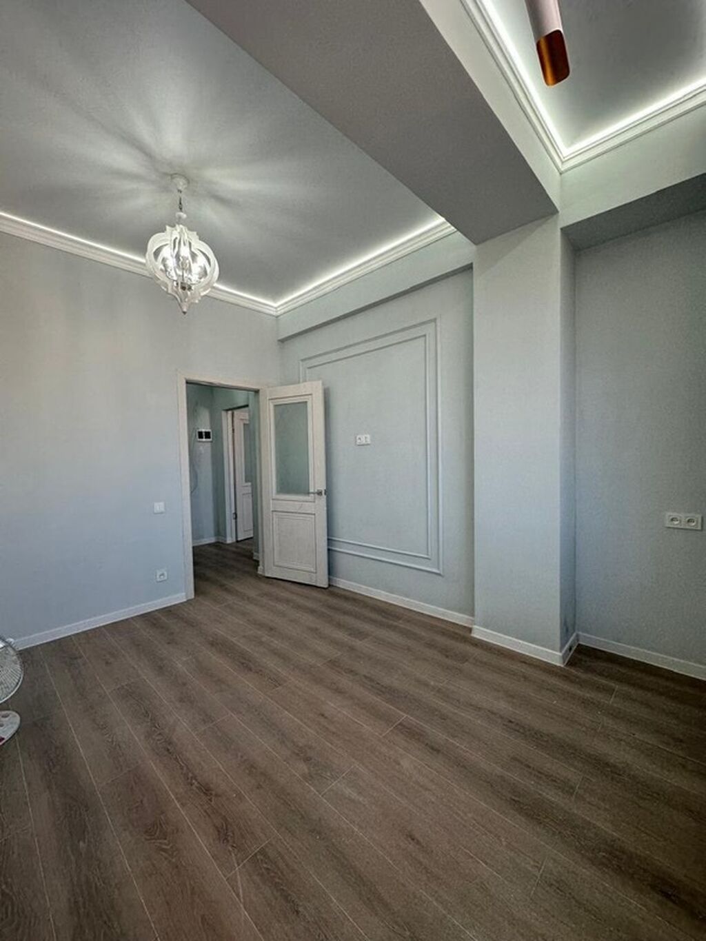 Светлые стены с молдингами, натяжные потолки с LED-подсветкой