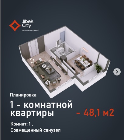 Продаётся 1к. квартира в центре, 48,1 кв.м ЖК, Жибек сити