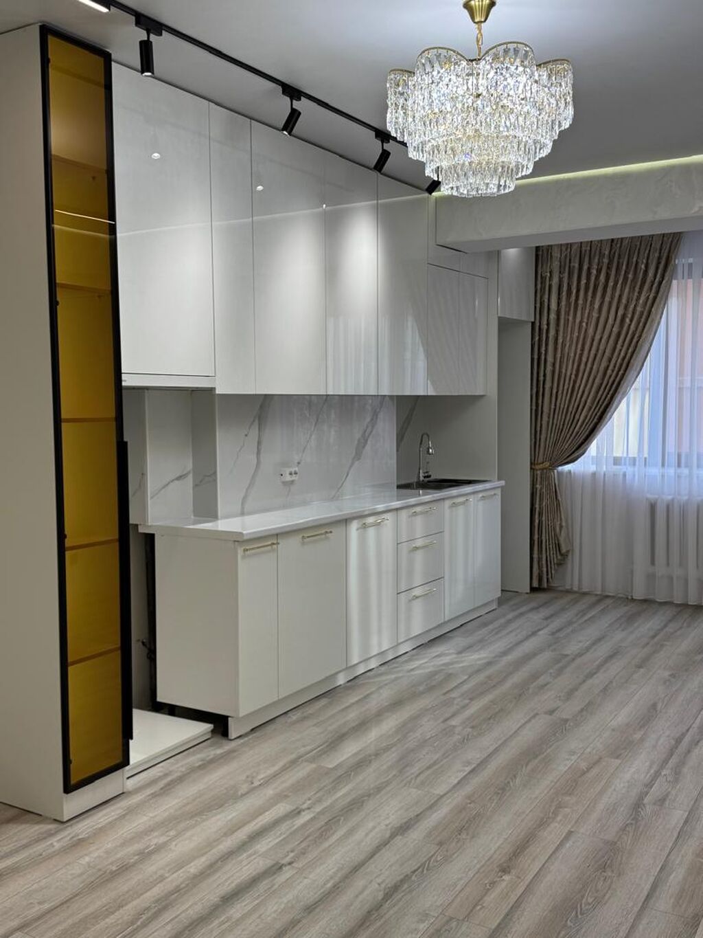 — Кухня-гостиная с глянцевым гарнитуром, столешница и фартук под мрамор
