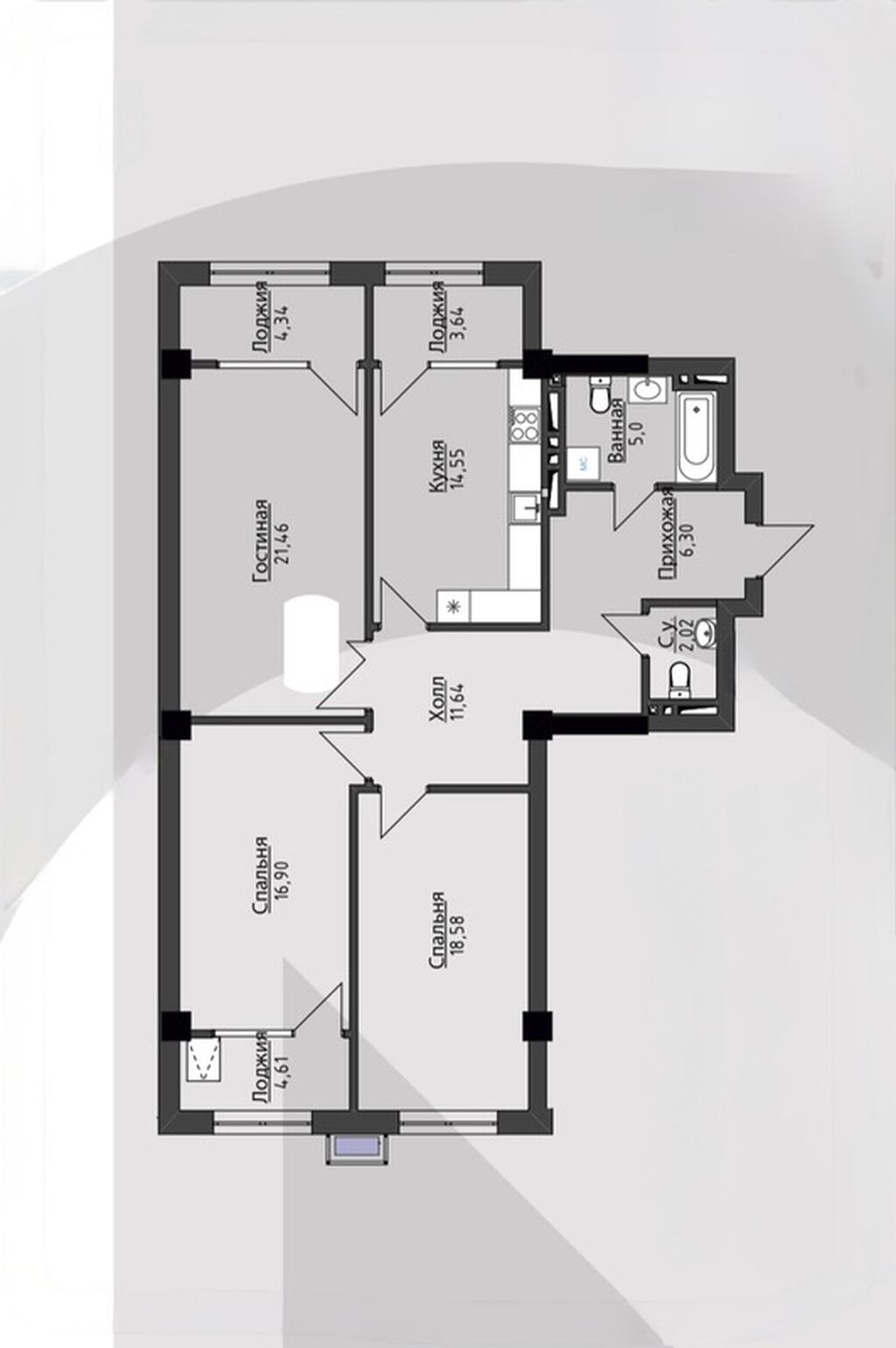 - 3-комн. квартира ПСО – 109 м², 4/13 этаж, не угловая.