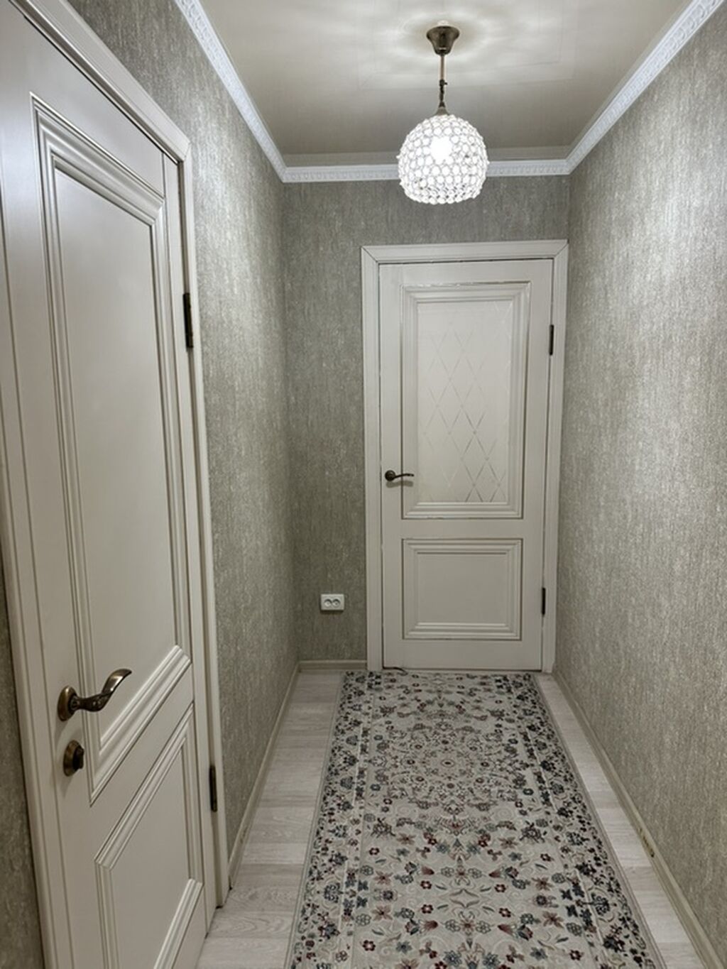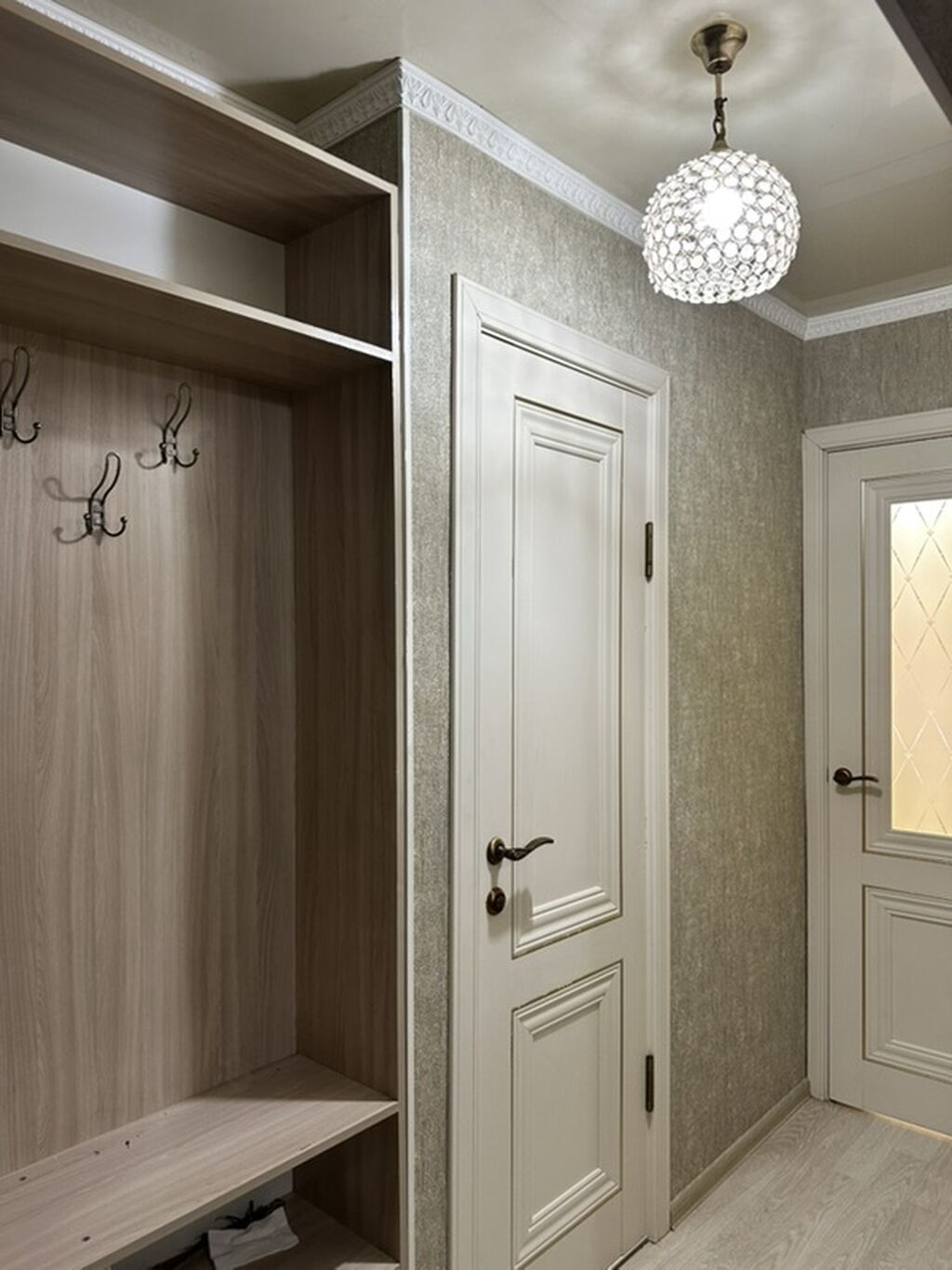 Интерьер выполнен в тёплой цветовой гамме, с использованием дорогих материалов и продуманной отделкой: лепнина, изысканные обои, декоративные элементы — всё создано для комфорта и эстетики.